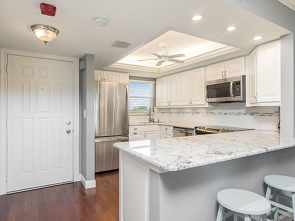 Take in all of the views from this top floor residence located minutes from downtown Naples. Featuring 2 bedrooms, 2 baths, open concept kitchen with custom white cabinets and granite countertops, renovated bathrooms, wood flooring, washer/dryer and impact glass. The amazing golf course views are further complemented by the highly sought after southeast exposure. There are 2 covered parking spots with this unit. High Point is a private 55+ community which provides its residents with a challenging, unique par 3, 9-hole golf course allowing unlimited play, 6 heated pools, a newly renovated clubhouse with restaurant on site, tennis, bocce, pickleball and an abundance of social activities. Great location close to restaurants, shopping, theatre, boating, beaches and Naples Airport.