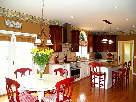 Feels like new! This majestic colonial welcomes with a two story foyer with hardwood floors, steps and a curved banister and features a wealth of amenities and recent updates. Off of the foyer are a formal living room and dining room. The formal dining room is expanded and has hardwood, chair rail and crown/dentil moldings. The highlight of the incredible home is the European style kitchen featuring everything for the gourmet chef! Every detail is thoughtfully designed and features top of the line appliances such as Fisher &Paykel stove w/pot faucet, externally vented Jenn aire exhaust hood, food warmer drawer, GE Advantium Speedcook Ovens, Meile built-in coffee/espresso maker, GE Monogram convection oven and wine cooler/refrigerator. The kitchen has tumbled marble style back splash with decorative inlay, cherry 42” cabinetry with designer hardware and under cabinet lighting, granite counter tops and more! There is a spacious dining area and is open to the oversized great room/family room with a cathedral ceiling. This room runs front-to-back and opens through French doors to the large deck with sweeping hillside views. This house features many updates including hardwood floors, newer carpeting, professional painting, decorative moldings, upgraded lighting and many distinctive design details. There is an update powder room and a large laundry room with a coat closet. Upstairs are four large bedrooms. The master suite is spacious with newer carpeting and has a walk-in closet and a luxurious master bath with a Jacuzzi tub. The second bath has two sinks and neutral tile. The remaining 3 bedrooms are large and there is an abundance of closet space. The property has landscaping on all sides and also has shutters on the back and side as well as on the front. Meadow Run South is conveniently located near schools, shopping and easy access to public transportation. Blue Ribbon awarded schools.