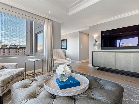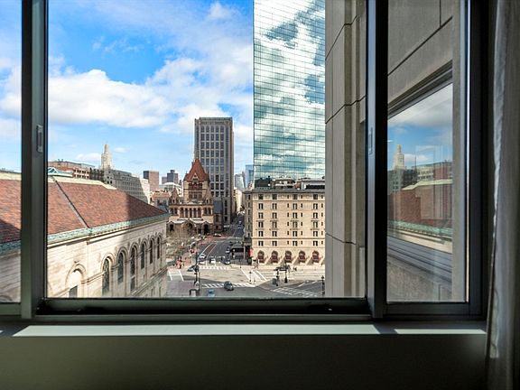 ULTIMATE SOPHISTICATION . This Designer SHOWCASE at Trinity Place truly epitomizes elegance and sophistication, offering unparalleled views of Boston's iconic landmarks. Situated in the heart of Copley Square with Trinity Church and the Spanish Roof line of the Boston Public Library and the famous Hancock Tower. The formal foyer adorned with double closets, leading into the front-facing and elegant living room with adjacent dining nook, built-in sideboard and wine cooler beckons for intimate meals with stunning views. Well-designed Chef’s kitchen featuring natural quartz counters and backsplash, top-of-the-line appliances, and ample storage. The luxurious primary bedroom suite boasting three large closets and an ensuite marble bathroom. A large second bedroom and bathroom provide additional comfort and convenience. Residents of this boutique building enjoy a 24-hour concierge, a fitness center, storage and 2 valet garage parking spaces.