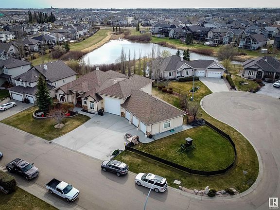 Immaculate, custom-designed residence nestled on 2 expansive corner lots, fenced and picturesque views of a serene pond. Situated Harvest Ridge community, with convenient access to Hwy 16, this home offers unparalleled luxury and functionality. Stunning 4-stall garage complemented by indoor RV parking. Inside to discover approximately 2800 sf on the main floor, with 10 and 12-foot ceilings, luxurious Italian porcelain and hardwood floors. Gourmet kitchen is a chef's dream, equipped with double center islands, Corian countertops, dual refrigerators with ice and water dispensers, two built-in convection ovens, and two microwaves. A 48 double oven range with a custom hood fan and a Miele Coffee system. A walk-through pantry with solid wood shelving adds convenience and organization. A walk-out basement, a vast family room, separate games room. Three bathrooms. Outdoor living is enhanced by a beautiful upper deck spanning the length of the house, offering sweeping views of the yard and pond nearby.