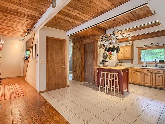 This charming "A Frame" home offers lake access for all your water recreation needs. Deeded lake frontage with beautiful views. Home has wall of windows and open floorplan on 1st floor and triple sliders overlooking the lake in the master bedrm wIth small balcony. Truly a vacation year round home. The oversized 2 car garage has an addit'l 575 sq. feet of heated space on the 2nd floor..ideal for a game room or office space. The roof is 5 years old, newer windows, 2 baths and 3 bedroom septic.