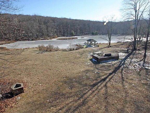 Tremendous value in this 6000 sf custom home situated on a 5 acre lakefront lot. Enjoy the outdoor kitchen and covered dining area on the dock at the waters edge, or the elevated patios w lake view. Custom designer kitchen w lovely eat in area makes the most of the view with soaring ceiling and high windows, opens to 27' family room with a wall of glass, sliders to the huge covered patio. Formal Dining room has pocket doors, huge crown moldings throughout. HW floors are wide plank, stained dark. Master Br on first floor also overlooks the lake with another walkout to the patio, his/hers walk in closets, huge Master bath with separate shower, 2 pedestal sinks, jetted tub. Private and majestic. Second floor has another master suite, huge rec room, play room. Walk out basement is high and dry w fireplace.