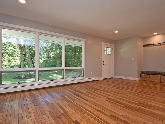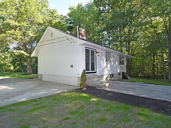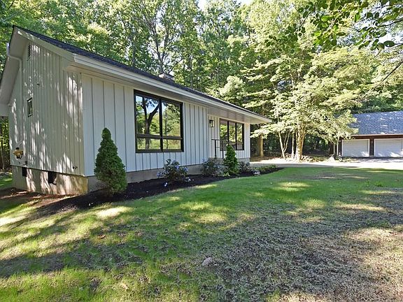 Completely renovated and stunning ranch perfectly situated on 2 acre wooded lot! Enter in to the contemporary open concept living/dining room with a mudroom area, floor to ceiling windows, exposed beams and electric fireplace. Large kitchen with Quartz counter tops, an island with breakfast bar, brand new s/s appliances, recessed lighting, beautiful tile back splash and a slider to the back patio. A half bath right off the kitchen with convenient 1st floor laundry. Master bedroom features HW and floor to ceiling windows. Another bedroom with HW and recessed lighting. A full bath with tiled tub and shower to complete the main living area. Basement provides a bonus room w/ a wood stove and extra storage space. Outside offers a large patio with granite steps, a 2 car detached garage, stone walls & mature hardwood trees. New roof, freshly painted in and out, soft close drawers in baths & kitchen, walk up attic w/ plywood floor & lrg loft area over garage - bring your ideas! See it today!
