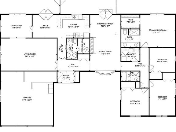 Rambling Ranch on corner double lot, county taxes. Nicely updated with carpet, interior paint, wood floors. Updated bathrooms. Extensive remodel of primary bath, with dual sinks, step in shower, closet organizers in walk in closet. Expansive All season room got new windows and heat pump, with wood stove for all year around comfort. Two HVAC systems in 2022 with smart thermostats. Water heater 2022. Roof new 2018. Soaking sink in Laundry. Kitchen with hard surface countertop, build in appliances. Breakfast area leads to covered rear deck overlooking fenced yard. Garden shed for those garden tools. Cellar for storms or wine (maybe both ;). Pull down attic access. Ramp in garage can stay. Thermo blinds on most windows.