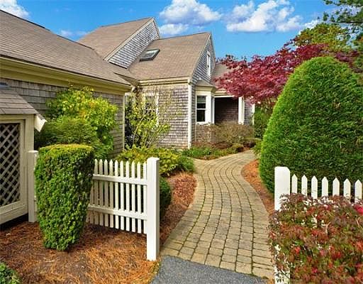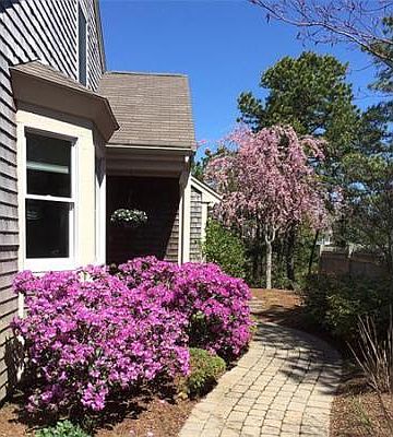 Exquisite Pinehills townhome, built by the Green Company in Winslowe's View. This 2 bedroom, 2.5 bath home has a lovely garden courtyard and is located at the end of a quiet street. Very Private setting! Popular floor plan with fireplaced living room, separate dining room, and 1st floor master suite, with double closets. Spacious kitchen features wood cabinets, Zodiac countertops, recessed lighting, and opens to a cozy family room and breakfast area. Audio speakers throughout the 1st floor. 2nd level has a guest bedroom suite, loft, & office area. Enjoy the private wooded views while entertaining on the mahogany deck and walk to the pool, tennis courts, post office and clubhouse. Walk-out lower level for expansion. This home is move-in ready!