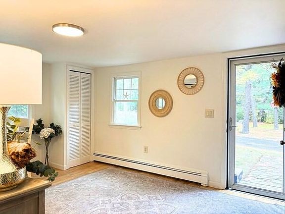 Absolutely fabulous opportunity to stop renting and start owning! Adorable YEAR ROUND home (NOT a condo!) is perfect for someone just starting out or looking to downsize and only 20 minutes to the Cape Cod Canal. Do not be fooled by its square footage - it has a lovely fenced yard, plenty of parking and glimpses of beautiful King's Pond (community beach) through the trees. Many updates in 2023 and 2024 - new windows (3), new roof, well pump, pressure tank, gutters, bathroom updated, and paint! An open living room with hardwood floors shares with an eat-in kitchen nook and petite but well appointed kitchen with granite counters. A side entry door allows for easy flow from the kitchen to the back and side yard for the summer days of BBQs and firepits. Two bedrooms with vinyl plank floors are big enough for queen beds. The stacked washer dryer means no more lugging clothes to the laundrymat. This is a rare, fabulous opportunity to own a true, freestanding home near all the shops of Plymouth.