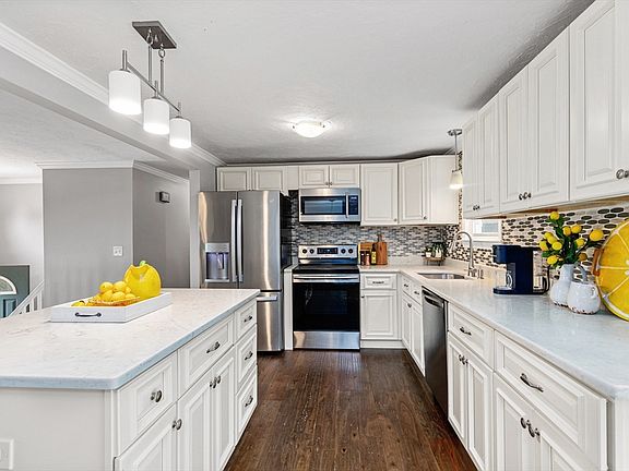 Come and see what 1 Lakenham Drive has to offer! This home is warm and welcoming and boasts many upgrades inside and out. Property is located at the beginning of a cul-de-sac neighborhood on a corner lot with mature trees for privacy. Living room and kitchen share an open floor plan which allows for plenty of natural light through out. Kitchen features granite countertops, soft close cabinets, s/s appliances, and island. Slider off the dining area leads to a large deck and fenced in back yard with new shed (2023). Upstairs has 2 bedrooms and tiled full bath. Large primary bedroom features 2 closets. The 3rd BD is on the finished lower level along with family room w/bar perfect for entertaining. The 1/2 bath (2019) w/ W/D hook ups are also on the lower level along with more storage and utilities. House features central air (2019) and full house generator (2024). Solar panels (2024) Main floor has been freshly painted and the attic has been fully insulated through mass save. Roof (2019)