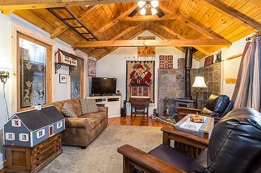 Welcome to this super cozy antique Farmhouse beautifully maintained with loads of charm ! When you enter you immediately feel the warm glow of the wood burning stove in the Family Room , complete with Cathedral Ceilings , wooden beams , 10 inch pine floors ,and glass french doors that open to the private back patio area . The next surprise is the updated Maple kitchen with duel fuel gas range , working island , filled with nooks and storage areas reminiscent of the unique details found in an antique farmhouse. The features that make an antique so special have been maintained and the necessary updates that have been done (in 2007) include furnace(high efficiency ), roof ( with waterproof planking), windows (Anderson ) , structural work , new deck , new front door , and several other updates. This home is truly in move in condition. The "in law "setup has its own entrance and has framing for an interior door so it could easily become part of the main house