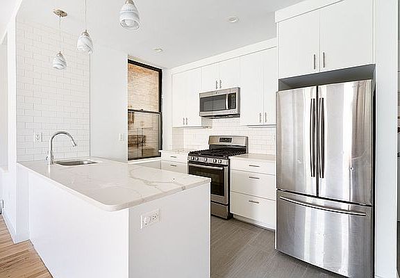Renovated 3-Bedroom/3-Bathroom Duplex with Private Garage in Prime North Slope A private garage, located directly next to the building entrance, is included in the rental of apartment 3/4D . This third/fourth floor duplex apartment enjoys a perch above 5th Avenue and Lincoln Place in North Park Slope. Entered on the third floor, the main living space includes a renovated open kitchen with breakfast bar peninsula, and an open living space with a decorative fireplace. Three large windows provide western light to this area, and there is ample space for separate, but free-flowing living and dining areas. The renovated kitchen is fully appointed with a suite of full-sized stainless steel appliances, Caesarstone countertops, and plenty of storage inside modern white shaker cabinets. There is also one full bath on this floor, along with tremendous storage under the apartment's interior staircase. The fourth floor includes three bedrooms and two full bathrooms, along with the in-home washer/dryer. The primary bedroom faces west over 5th Avenue, with two large closets and three large windows. Towards the center of the apartment, two more queen-sized bedrooms with excellent closet space are separated by the two renovated bathrooms, both of which are off the upstairs hallway. Modern amenities in this beautifully renovated apartment include an in-unit washer/dryer, fully appointed kitchen, and recessed lighting. Tenants control their own heat. Having recently undergone a complete modernization, the common areas have been updated and the building has been equipped with the Latch keyless security system, allowing residents to securely and remotely manage access. A full-time managing agent is professional and responsive, providing an online portal for rent payment and maintenance requests, as well as a dedicated superintendent. Subway stations nearby include the R-train at Union Street, along with the B, D, N, Q, R, 2, 3, 4 and 5-trains at Atlantic Avenue-Barclays Center. Enjoy outdoor dining or takeout from great local eateries on 5th and 7th Avenues like Katsuei, Bogota, Negril, Alchemy, Stone Park Cafe, Calexico, and al di la Trattoria. The main entrance to Prospect Park, home of the Grand Army Plaza Greenmarket (every Saturday, year-round), is just a short trip away. Please note that photos have been virtually staged.