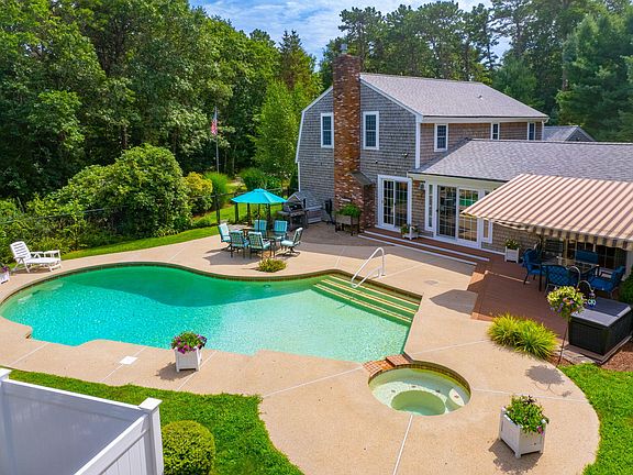 Introducing an enchanting 4-bedroom, 3-bath haven nestled in the heart of Mashpee. Set off Great Neck Road South and nestled on a tranquil, private side street, this coastal gem offers proximity to South Cape Beach, Mashpee Commons, and the New Seabury Marketplace.Step into a world where comfort and elegance intertwine seamlessly.With central AC, savor a refreshing escape from warm Cape Cod summers. A first-floor bedroom adds versatility for family, while wood flooring and ample storage spaces amplify both practicality and coziness. A spacious living room with a gas fireplace adds an inviting touch. Unwind in your own private oasis, where mature plantings encircle an outdoor shower, ideal after a beach day. The pool and spa area provide the canvas for unforgettable gatherings, while the expansive yard invites summer games and relaxation.Discover culinary inspiration in the modern kitchen, adorned with granite counters and stainless steel appliances. Step down to the finished lower level with direct exterior access, revealing a spacious family room, additional bonus room and a full bath. This adaptable space accommodates overflow guest needs. This home is your portal to a life defined by coastal elegance and comfort. Deeded rights to Follins Pond and close to bay side beaches.