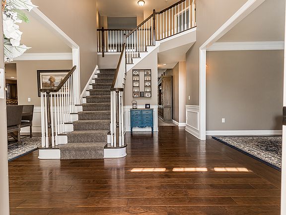 This beautiful 3 year home with in town location and walk to elementary school is rare find. The home has been upgraded with over 90, 000 in amenities. Elegance starts the moment you enter this 2-story foyer flanked by a Flex Room and Dinning Room enhanced by extensive mill work and hardwood floors. The Great Room enjoys a 10 ft ceiling showcasing the upgraded stone gas fireplace. A chefs kitchen boosts a tiered sit up island, granite counters, tile backs plash, stainless steel appliances, gas cook top, wall oven, convection microwave, a pantry, and laundry rm nearby. The over sized breakfast room was a bump-out upgrade that overlooks the deep fenced backyard w privacy trees across the back. The yard is large enough for a in-ground pool and more. The Second Level has the builder's optional Loft play room situated perfectly between the bedrooms and Owner's Suite. The Owners suite retreat offers a huge sitting room with options galore. Enjoy a sumptuous bathroom with double vanities, shower, soaking tub and commode room. The walk-in closet is a dream come true, his and her sides. Wonder down to the fabulous Finished Walk out Basement featuring a Wet-Bar that seats 8 comfortably, a full bathroom and and a Exercise room...Enjoy evenings by the fire pit on your paver patio...Nothing to do but bring your belongings and move in. Zoned HVAC Open House Sun 5 20 1-4 Gym Rm dimensions are 13.5x12