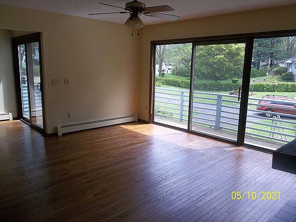 Small Complex, 4 buildings, 2 units each building on just under two acres. Walking distance to downtown Bethel or Danbury. Bus stop across the street. Bethel train station within walking distance. 5 minute ride to I-84. Lots of storage inside and out. This unit has a private (though still common property) side yard. Granit counter tops . Open floor plan living room/dining room and a half bath on the main level. Beautiful sunrises in the morning in the living room through the glass doors and fabulous sun sets in the evening through sliding doors in the kitchen that open to a balcony overlooking the driveway. 2 large bedrooms upstairs, both with walk in closets. There is a large bathroom upstairs with the bedrooms. Clean and ready to move in.