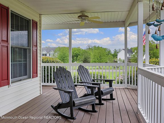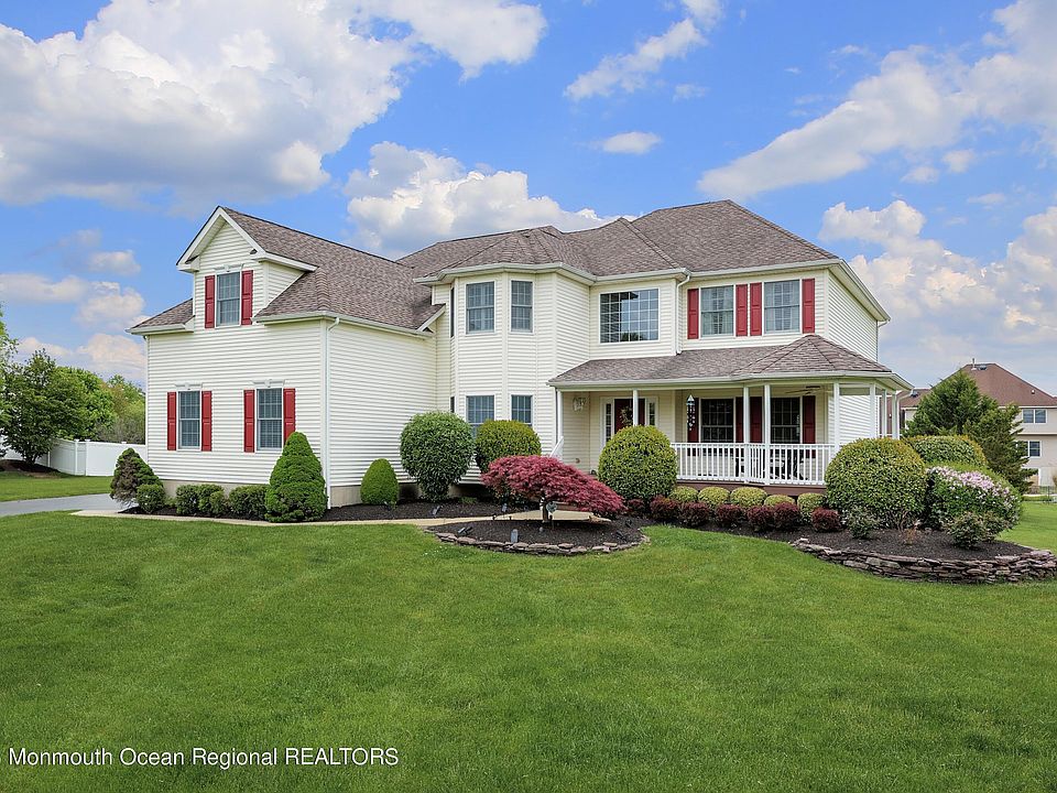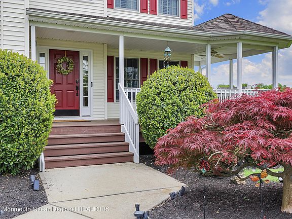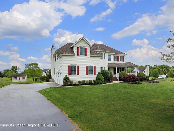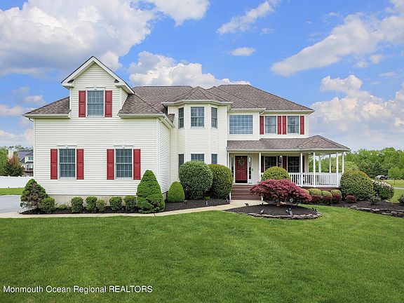 Welcome to the immaculately kept and stunning Diamond model home in the highly esteemed Jewel Ridge Estates. Boasting five bedrooms, 2 1/2 baths, and a three-car garage with side entry, this home is enhanced with a semi wrap-around porch, a marvelous walkout basement, and a beautiful inground pool that will undoubtedly captivate any residents or guests that enter. As soon as you step inside, you will be welcomed by an impressive two-story foyer with stylish hardwood staircase and floors. With 9-foot high ceilings, the first level creates a wonderful sense of space and is illuminated with natural sunlight. The large kitchen will undoubtedly appeal to those who love to entertain, featuring sleek stainless steel appliances, 42 inch cabinets and a huge breakfast bar with seating! Home boasts stunning 20 x 20 porcelain tiles, a Palladian window, and a large pantry for storage. The family room flows seamlessly from the kitchen, with cathedral and two-story ceilings, a cozy wood-burning fireplace, and a second set of stairs leading to the second level. The grand master bedroom is a real treat, complete with a relaxing en suite, a sitting room, and a walk-in closet, with one having a full window to let in more natural light. The luxurious en suite features recessed lighting, double sinks, a vanity, a shower stall, a soaking tub, and a private commode. All five of the bedrooms are generously sized and feature hardwood floors. From the sliders in the kitchen, step outside onto the inviting Trex-deck with custom side-railings with lighting, overlooking the inground pool - perfect for entertaining or relaxation. The full walkout basement is a flexible space, leading out to the level backyard on an oversized lot that has been professionally landscaped, features an invisible fence, a large outside shed, and a timberland roof. The 3-car side-entry garage has a separate entry door leading into the laundry/mudroom with a utility sink, while the fifth bedroom on the first level can be used as an office or study, ideal for those who work from home. The Cream Ridge community boasts award-winning schools and is one of New Jersey's most sought-after towns to live in, providing beautiful scenic views of farmland, rolling pastures, and hundreds of acres of open space. Additional upgrades include a newly updated kitchen with a backsplash, newly updated bathrooms, a new floor in the garage, a new pellet stove, and a new pool liner from last August.