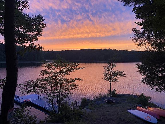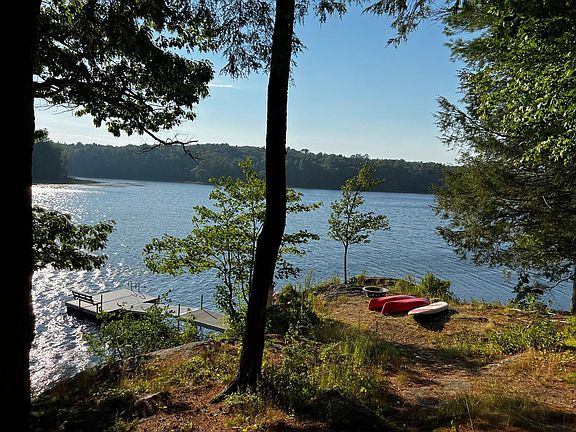 Lakefront living at its finest! Spectacular setting for this custom built Lindal Cedar Home. With 7 private acres and approximately 600' of water frontage on Boyd's Pond in Bristol, this gorgeous contemporary home features soaring ceilings, incredible woodwork throughout, high end finishes and fixtures, and amazing water views. Imagine all the fun you, your family and friends can have swimming, sailing, kayaking and fishing from your own dock & float. Grab a book and relax on the hammock and dream about making s'mores at the firepit. This spacious home has four bedrooms, three and a half bathrooms, 2 beautiful fieldstone fireplaces, and a large wrap around deck with 2 retractable awnings to enjoy the tranquil setting overlooking the water. The lower level is an entire separate suite, with a large great room including a full kitchen with island seating, bedroom and bath, and access to the outside and the lake. This is a great spot for extended family and friends or renters to have their own space and privacy.