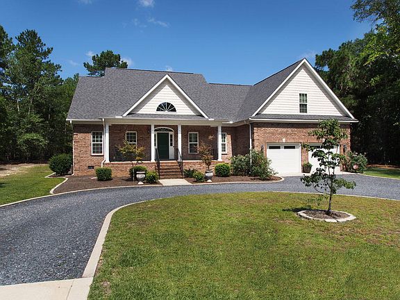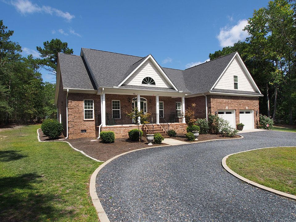 This lovely brick home has a wonderful location within walking distance to the historic Village of Pinehurst and to Rassie Wicker Park. Built in 2014, the home offers an open floorplan, hardwood floors, high smooth ceilings and lots of windows. The living room has recessed lighting, double crown molding, a stone fireplace with natural gas fire logs and double French doors opening onto an expansive covered porch. The very spacious master suite has a trey ceiling with double crown molding, recessed lighting and two large walk-in closets. The kitchen is light and open with cherry custom wood cabinets, granite countertops, farmhouse sink and stainless steel appliances. Also on the main floor is a formal dining room with hardwood floors and double crown molding, two additional bedrooms