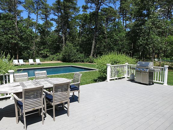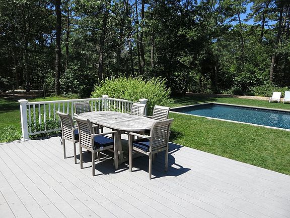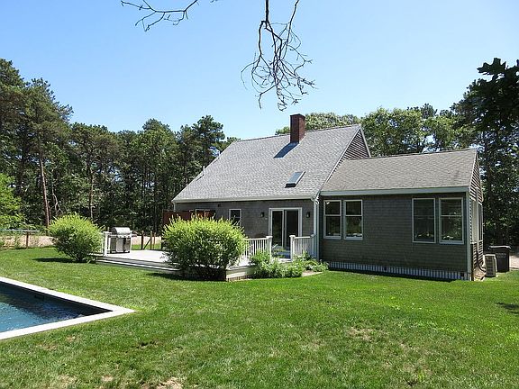 Stylish Designer Colonial Home with 4 bedrooms, 2 baths, 20' x 40' Heated Pool, Large Deck, Private Yard, outside shower, A/C, finished basement, pool shed, on over 2 acres with plans for 2 bedroom guest house and 2 car garage. Close Proximity to Edgartown Village Center and Katama South beach. The main living level features a large great room with windows wrapping the entire room, fireplace, and flat screen TV. Gorgeous designer furnishings enhance the appeal of this sun porch style living area, dining room, eat in kitchen with extra wine fridge. A total house make over has been done in the last year with new hot water heater for pool, new well pump, new roof, new deck, new a/c units, land clearing and more. Great rental history with this home and being sold turn key.