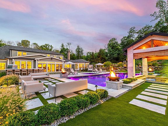 This property offers 4 bedrooms, 5 bathrooms, a two story great room, dining room, family room, kitchen, main level office, walk-in pantry, two wine closets, a laundry closet, sunroom, gym, bar, lower level office, and a finished basement. The kitchen features Jen Air Appliances, an oversized sub zero refrigerator, a built-in coffee maker, a 48 inch range with two ovens and six burners, and an oversized island.