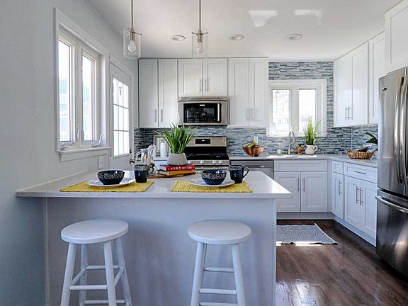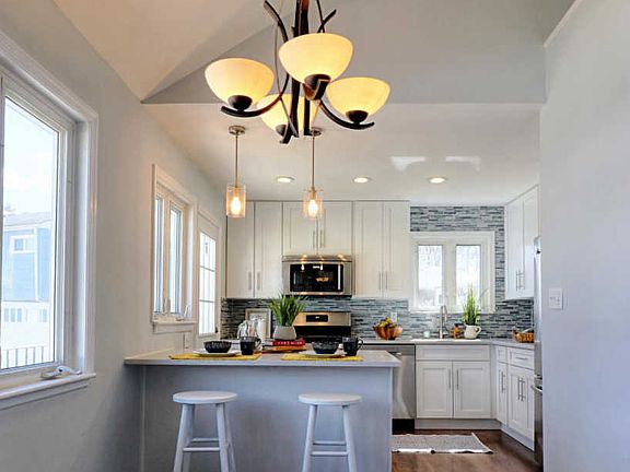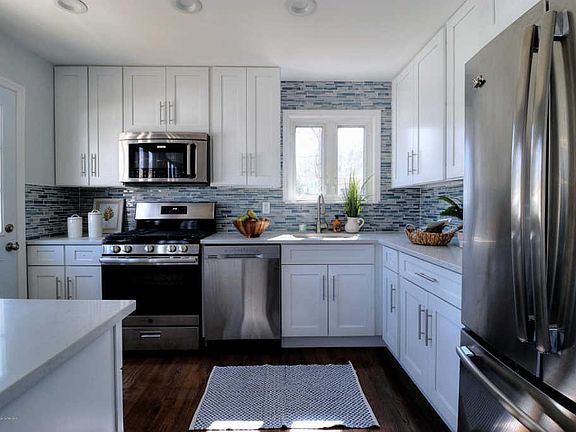 Beautifully renovated 4 bedroom, 2 bathroom corner lot home in prime Hazlet neighborhood. Everything updated! New kitchen includes white shaker cabinets, Carrera Marmi quartz countertops, glass tile backsplash, stainless steel appliances, and peninsula. High end finishes everywhere! Hardwood floors sanded and stained. Tall cathedral ceilings in the common area. Formal living room with built in wall shelving. Open layout with lined Anderson windows for family room, dining room, and kitchen. Lots of sunlight! Two full bathrooms with designer tiles and board and batten wall decorations. Generously sized bedrooms. Washer/dryer included. Single car garage with ample room for extra storage. Large vinyl fenced property with shed. Walking distance to school! Great location near Rt 35 , Rt 36, GSP.