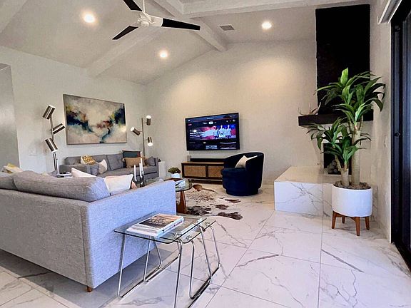 Best Panoramic Mountain Views and Sunsets in the Entire Valley Escape to "Mountain View Townhome", the epitome of desert luxury in this stunning fully remodeled mid-century modern oasis nestled in prestigious Mission Hills Country Club in Rancho Mirage. Tastefully appointed three bedroom, three and a half bath, all ensuite ensuring privacy for you and your guests. Indulge in the perfect blend of elegance and recreation with a state-of-the-art family room, gourmet kitchen and furnished terraces to take in the magnificent views of the San Jacinto mountain range. Key Features: three en-suite bedrooms, a powder room off the living and dining area, two balconies and two private patios, all with spectacular mountain views. Inside the secure gated community of Mission Hills Country Club with a two car garage attached to the property. Privacy and beauty surround you. Completely renovated interiors: step into a world where modern luxury meets desert chic, with interiors that have been updated top to bottom, featuring high-end finishes, state-of-the-art technology and bespoke design elements. Large open plan living room with large flat screen tv, stunning gas fireplace for those chilly desert nights, high ceilings and all new modern and iconic vintage furnishings with plenty of comfortable seating. Dive into the large lap pool just a minutes away, relax in the jacuzzi or lounge poolside soaking in the California sun, with breathtaking mountain views as your backdrop. Gourmet Kitchen: Catering to culinary enthusiasts, the kitchen is equipped with premium Viking appliances, fully stocked with a plethora of all new high end kitchen tools and utensils, Crate & Barrel dishes and barware and plenty of space for crafting delicious meals and entertaining. Sit down and dine at the iconic oval mid-century modern marble top dining table for 6. Two additional chairs are provided. Prime Location: Located in the heart of Rancho Mirage, you're minutes away from upscale shopping, fine dining, and outdoor adventures. Whether you're seeking a peaceful getaway to rejuvenate, a remote work paradise, or an entertainment-filled retreat, this vacation rental promises an unparalleled experience. The blend of privacy, luxury, comfort and scenic splendor make it a top choice for discerning travelers. This is a vacation rental with a 30 day minimum stay. The rent listed is for the main season. Rent varies by dates requested.