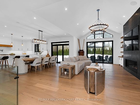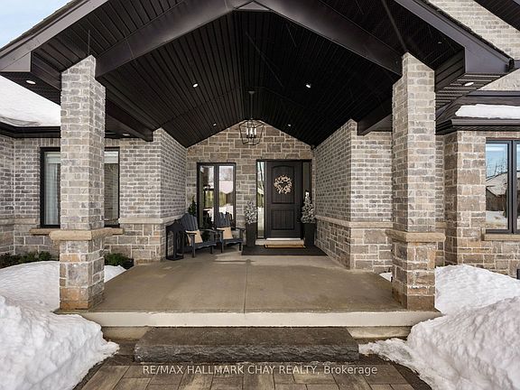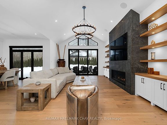 PRESENTING luxury, lifestyle, privacy, and an exquisite location-all embodied in this stunning custom executive residence in Springwater's prestigious, family centric Cameron Estates. Set on a premium half acre corner lot, this exceptional bungalow offers 5,700+ sq.ft. of finished living space and an oversized 133'x187' private backyard framed by mature cedars and one of the community's largest reclaimed greenspaces. With over $550K in recent updates/upgrades, this home delivers an elevated living experience inside & out. The main level showcases a designer Chef's kitchen with expansive prep space, oversized island with integrated beverage centre, premium Jenn Air 6 burner + griddle range, dual ovens, Dacor fridge/freezer, and walk in pantry with prep sink. Great room impresses with a striking 63" floor to ceiling gas fireplace, vaulted ceilings, and wall to wall views of the private rear yard. Additional main floor features include a dedicated home office, guest 2 pc bath, spacious laundry/mudroom, and three generous bedrooms-each with its own ensuite and walk in closet. The full, finished lower level doubles the living space and continues the home's refined neutral palette. Purpose built for relaxation and entertainment, this level features a spa inspired steam room, home gym with heated padded flooring, guest suite, custom four queen designer bunk room, rec room with linear fireplace and built ins, games room, home bar, office, soundproof gaming room, and additional 2 pc bath. Energy efficient water heated flooring runs throughout. Smart home conveniences include whole home audio (14 zones, 7 Sonos amps, 37 speakers), remote electric blinds, 7 camera security system, wall mounted TVs, and Bell Fibre internet. Car enthusiasts will appreciate the oversized 1,600+ sqft heated 5 vehicle garage, complete with epoxy floors, storage, EV ready wiring, built in audio/TV, pressure washer system, direct basement access with mud room, and rear garage door to the backyard.