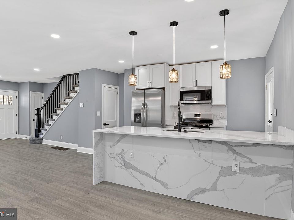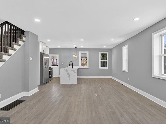 This beautifully remodeled end-of-row home offers 3 bedrooms and 2 full bathrooms, showcasing modern style and comfort from top to bottom. Recent updates include fresh paint, new carpets in the bedrooms and basement, new flooring, recessed lighting, all-new windows, a new A/C unit, updated plumbing, and an aluminum coating applied to the roof for added durability. The stunning kitchen features brand-new cabinets, quartz countertops, and modern appliances, along with a new washer and dryer for added convenience. Located in a highly convenient area near shops, dining, everyday amenities, and just minutes from Downtown Baltimore, this move-in-ready home combines high-quality renovations with an exceptional location. A must-see!
