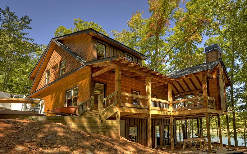 ^LAKE BLUE RIDDGE LIVING^ New Construction chalet lodge style home nestled at the waters edge w/ amazing lake & mtn. views. Amazing flat deep water frontage w/ permit for boat dock w/ boat slip & swim dock in the most upscale lake front community, Necowa Cove. 4BR, 3.5BA's floor plan - Living Rm features a wall of windows w/ soaring cath. ceilings, fixed glass windows, Rock FP & wood floors. Many modern rustic accents - Lg. covered party porch w/ real wood burning outdoor Rock FP connecting to wrap around porches & huge vaulted porch from GR. Master features walk-in tile shower & separate soaking tub + private balcony. Fin. basement features BR, BA + REC/Media Rm w/ gas log FP & wet bar. Upgrades incl: granite countertops, rebar & large timber posts & pickets, custom cabinetry, upgraded lighting & more. Construction by Big South Builders.