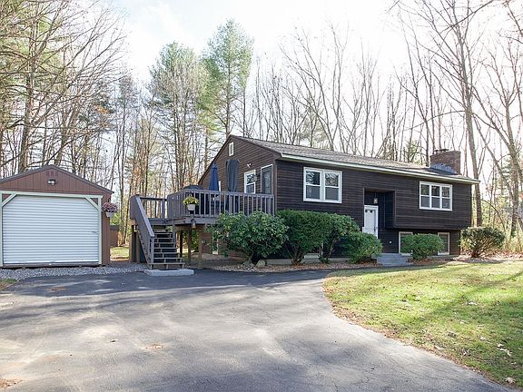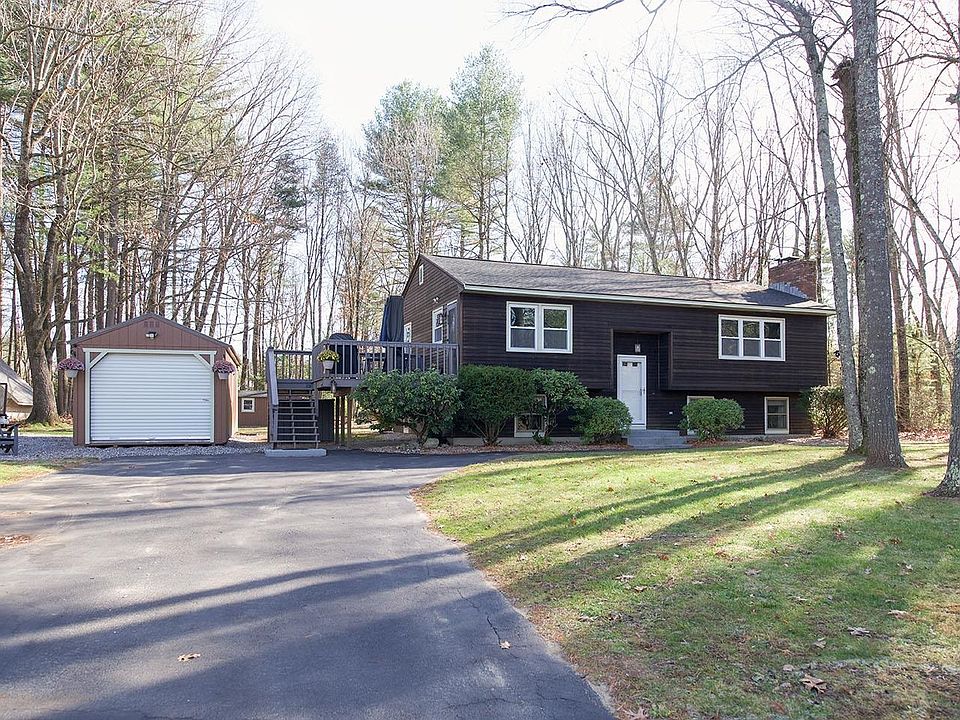 Welcome home to 1 Nesenkeag Drive! The move in ready home features a sunlight filled living room with a white washed hearth surrounded by custom built ins, an eat-in kitchen with stainless steel appliances, 3 bedrooms on the main level with hardwood floors and a full bathroom with a modern vanity and tile. As you make your way to the lower level you will find the primary suite with a custom tiled shower and soaking tub along with a versatile space that can double as a media room and office. Great for entertaining, the space has a pellet stove and wet bar. Summertime will be a blast with the above ground pool, swing set and lots of space for outdoors activities. There is a shed to store you lawn tools and equipment along with a 12x28 one car shed to store a car, ATVs or snow mobiles. Many updates include a 1 year old roof, replacement windows, life proof vinyl flooring and a freshly sealed driveway.