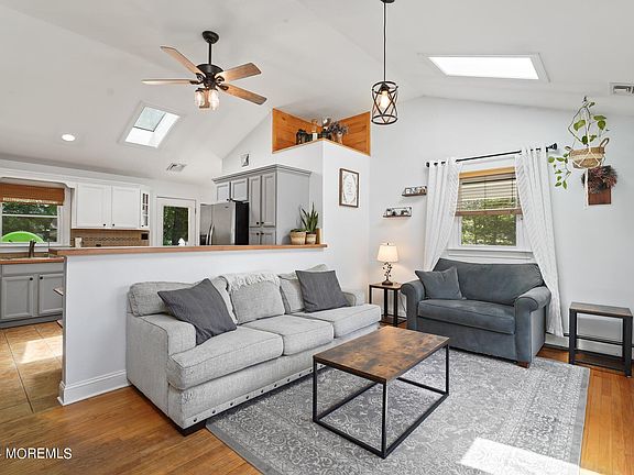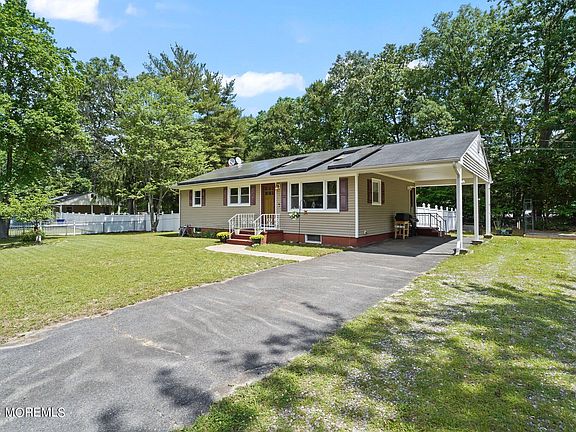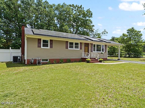 Welcome to a place to truly call home. On an over-sized corner lot find this 3 bedroom ranch furnished with a full basement. Upon entering you'll be welcomed by a beautiful living space complete with a built-in wall unit featuring an electric fireplace, updated lighting, fan and vaulted ceilings accented by skylights allowing for soft, natural light to fill the space. Hardwood flooring runs through the living area through the bedrooms. The kitchen features plenty of counter space and cabinetry. Two glass doors add ease in entertaining leading to your car port and PCV fenced backyard. Additional bonuses include: the home was converted to GAS, NEW fully replaced water softener system, septic system consistently serviced, tankless HWH, and transferable solar panels. Finally, enjoy the ease of access to route 9 shopping and commuting. Come make this one yours.