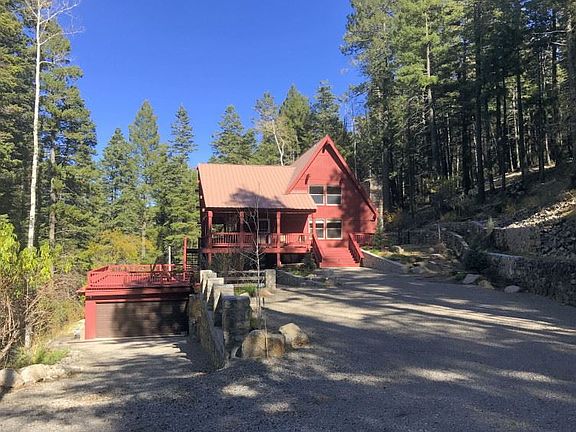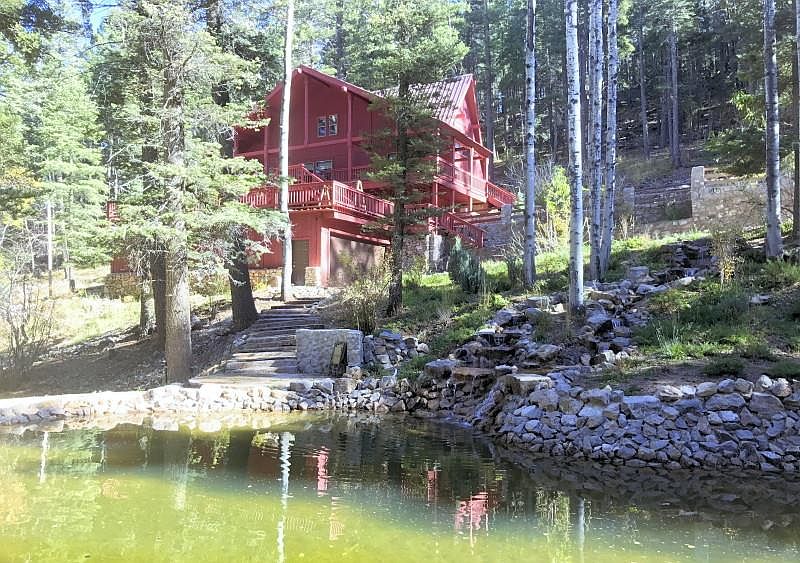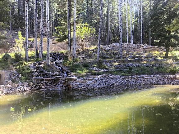Mountain masterpiece -13.5 acres bordering Ntl Forest features pond with soothing sounds of tumbling waterfall. Beautifully remodeled home sits above waterfall; huge decks for perfect outdoor living. Inside features many flex spaces, hardwood floors, new kitchen has granite counters, dry stacked stone fireplace, pretty tiled baths. Lower level media rm, study, studio, tiled floors. 4 car tandem garage has doors & drives on both ends. Stone retaining walls, private road, 2 gated entrances, outbuildings.