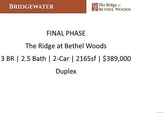 FINAL PHASE-The Bridgewater on the Ridge at Bethel Woods' is the latest duplex style two-story townhome in this community with three large bedrooms on the upper level. The open floor dining room/living room area features sliders leading to the outdoor deck. The large kitchen area features a multi-purpose island as an airy breakfast area. A power room and large guest closet add to the functionality of the first floor. The second floor features a master suite and two additional bedrooms. The spacious master suite features a walk-in closets and a master bath with shower stall and double vanity. A second floor laundry area and linen closet add to the convenience of this home along with a 2-car garage.