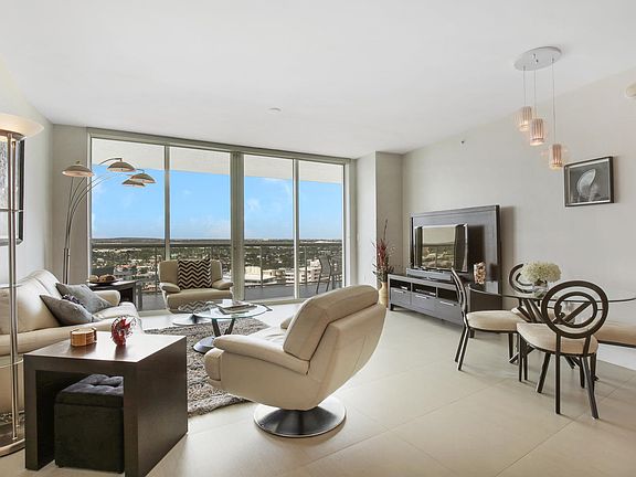 Welcome to the Plaza at Oceanside Luxury Lifestyle ! Gorgeous Unit w/ Intracoastal/Ocean/City Sunset unparalleled stunning views ! Open floorplan 2 bdr/2 bath split design sky residence is immaculate and stylish. Entry foyer opens into a grand salon living/dining area with floor to ceiling windows capturing the panoramic view. European designer kitchen, Poggenpohl cabinetry,Viking SS appliances, granite countertop, designer backsplash. Expansive master suite opens to the terrace with two walk-in closets and a luxurious bathroom with Roman tub, shower and two-sink vanity. The guest suite to the right also features sliders to the terrace and has a walk-in closet and bath. The Unit features tremendous designer furnishings thruout including 24 inch porcelain tile floor