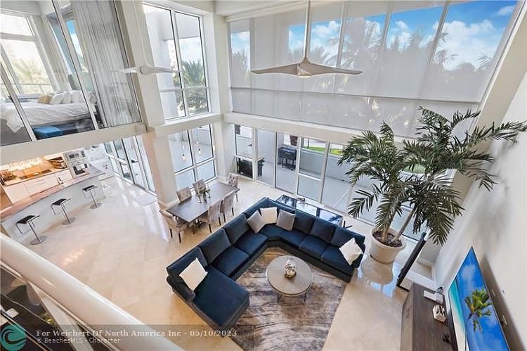 Beautiful loft style corner unit in The Plaza at Oceanside in Pompano, quick walk to the beach. It???s very unique in that it has no units above, below, or beside. A very private and quiet oasis. One of the largest units in the building with a massive outdoor patio! It has 3 bedrooms + large den that is currently being used as a bedroom. The main bedroom has it's own balcony. Most rooms in this ???smart home??? have automatic blinds curtains. There is also a wet bar. Two garage parking spots with a power outlet close by the entrance to the unit. The building has EV charging stations via a paid app account. An impressive free breakfast is served 6 mornings per week in the News Cafe. There is a front desk concierge. One of the few buildings that will allow 2 large dogs! Building has many amenities