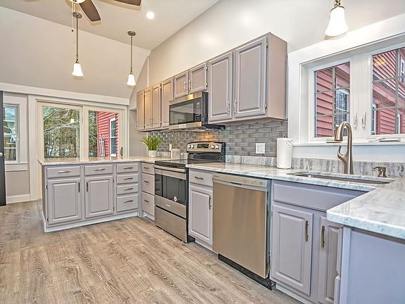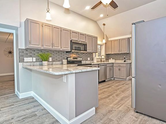 - Kit Dscrp: Flooring - Vinyl, Pantry, Countertops - Stone/Granite/Solid, Stainless Steel Appliances, Recessed Lighting, Remodeled, Exterior Access, Peninsula, Lighting - Pendant