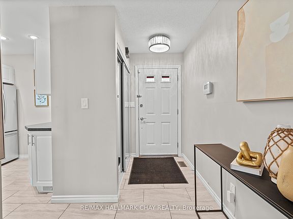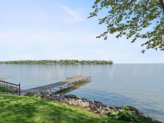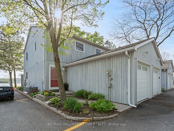 Welcome to this rarely offered, beautifully upgraded end-unit waterfront townhouse condo-a perfect retreat for professionals, young couples, downsizers, or those seeking a peaceful getaway. With views of Lake Simcoe, over $100,000 in thoughtful renovations, and a low-maintenance lifestyle, this move-in-ready home is as serene as it is sophisticated.Step inside to a spacious foyer with custom closet organizers, setting the tone for the clean and well-designed layout throughout. The chef-inspired kitchen was fully remodeled in 2017 and features granite countertops, sleek ceramic flooring, stainless steel appliances, and a functional breakfast bar with bonus storageideal for both everyday meals and entertaining.The open-concept living and dining space is equally impressive, with newer vinyl flooring, a cozy wood-burning fireplace, and sliding doors that lead to your private deck. Out back, enjoy peaceful mornings or stunning sunset views under your electric awning, surrounded by raised flower beds and a secure gated enclosure for added privacy.Upstairs, both bedrooms have been enhanced with new laminate flooring, and the renovated main bathroom brings spa-like tranquility to daily routines. The primary suite offers an electric fireplace, in-suite laundry, a fully renovated ensuite bath, and a private balcony with western lake views-imagine waking up to the water every morning.The fully finished lower level provides even more space to unwind, with a large rec room finished with hardwood floors, a third full 3-piece bathroom, and extensive built-in cabinetry for smart storage solutions. The attached garage includes a generous mezzanine loft, perfect for seasonal or hobby storage.Set in an exclusive 9-unit waterfront complex, this home is directly across from Kitchener Park25 acres of green space, tennis courts, a dog park, and scenic walking trails. You'll also love being close to marinas, shopping, downtown Orillia, and Casino Rama.