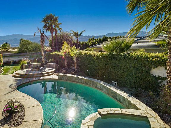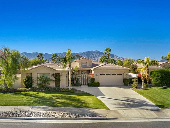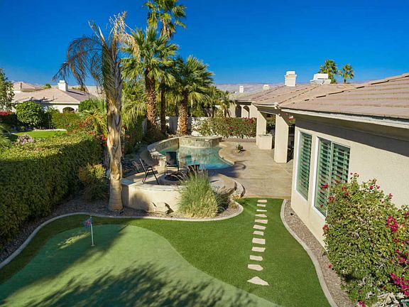 Situated in one of the valley's premier gated communities, VERSAILLES, this beautiful home is a spacious 3,075 sq. ft., sits on over 1/4 acre and features 3 large bedrooms plus Home Office/4th bedroom, a 3-CAR GARAGE and includes a SPARKLING POOL & SPA with preferred SOUTHWEST SUN EXPOSURE! The backyard is a welcome retreat with it's EXPANDED COVERED PATIO, built-in BBQ island, raised FIREPIT and an impressive artificial lawn GOLF PUTTING GREEN with a CUSTOM WALL MURAL that depicts a beautiful golf course and lake view...it's the perfect backdrop as you practice your putting game or when relaxing or entertaining outdoors. In addition to all of this...it's professionally landscaped with mature palms, delicious citrus trees and amazing MOUNTAIN VIEWS! The interior is just as impressive with high ceilings, a formal entry portico featuring beautiful marble floors and recessed art niches, MULTIPLE FIREPLACES and large picture windows and sliders in the gathering rooms, each opening out onto a picturesque yard. The CHEF'S KITCHEN is extraordinary with quality cabinets and appliances, sophisticated granite counters, with lots of prep area and storage space. The pantry is so large, there's even room for a 2nd refrigerator. How convenient is that?? A complete list of UPGRADED FEATURES is available upon request. You're invited to visit our VIRTUAL TOUR but you'll definitely want to view this home in person. There's just too many wonderful features that aren't captured on camera.