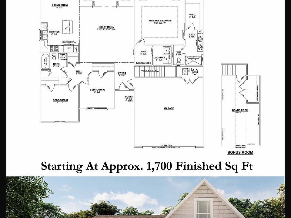 This 3 Bed/2 Bath home features a cozy front porch, foyer, spacious great room with vaulted ceiling, open floor plan, split bedrooms, first floor laundry room with pocket door, and built-in entryway cubbies w/hooks. The eat-in kitchen offers stainless steel appliances, granite countertops, island, pantry cabinet, and roomy breakfast nook that walks out to the back sun patio! Primary suite offers an elegant trey ceiling and en-suite bath with pocket door, double vanity, built-in linen tower, water closet, large walk-in shower, and spacious walk-in closet. Second floor features a large bonus room that could serve as an additional bedroom, playroom, or office space.*Floor plans and exterior details subject to change. Our online floor plans and renderings are only intended to give a general indication of the proposed layout and amenities.*