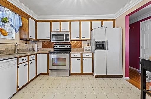 - Kit Dscrp: Flooring - Vinyl, Dining Area, Countertops - Stone/Granite/Solid, Lighting - Overhead, Crown Molding