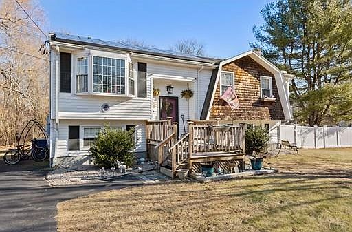 Nestled in a spacious, quiet neighborhood in East Norton just minutes to 495, you'll find this raised ranch on a beautiful level lot abutting conservation land. The hard work is done here: the roof is just 5 years old, central air installed less than year ago. Many updates done on the main floor within the last 3 years too, including refinished hardwood floors, crown & picture frame molding, a full bathroom remodel, & newly rebuilt front steps. The kitchen boasts painted cabinets, quartz countertops, & a tile backsplash. 3 beds & 1 full bath upstairs; full bedroom, bathroom, den, & family room w/a built-in bar downstairs, along w/laundry, tons of storage, and a walkout basement w/patio that takes you straight to the 30x15 above-ground pool. Solar panels on this home make it energy-efficient--and your electric bill nonexistent! The backyard has a privacy fence & an oversized cedar shed, as well as a screened-in porch which runs the length of the house.