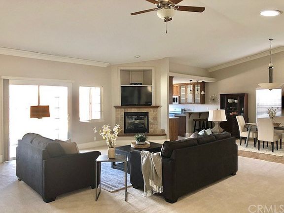 This beautiful home is located on a large corner lot in a desirable quiet neighborhood just a short drive to downtown and highway 99. The home has a spacious open floorplan with a large tiled entryway, vaulted ceilings, crown molding and high baseboards. The great room has a gas fireplace with built in entertainment center (TV included) and large sliding glass doors that access the back yard. The kitchen offers granite countertops, tile floors, breakfast bar, garden window, refinished cabinets and newer appliances including gas range, microwave and refrigerator. There is a spacious dining room that opens into the great room. The master bedroom has double closets and access to the back patio. Master bath features a large soaking tub, enclosed tile shower, dual sinks, separate toilet room and tile counters and floors. One bedroom has a built-in desk and surrounding storage cabinets that would be perfect for an in home office. Other amenities include whole house fan, tube skylights, ceiling fans, faux blinds, wired for surround sound, interior laundry, newer carpet throughout and fresh interior & exterior paint. There is a 3 car garage with an easy to clean epoxy floor and built in storage along with additional portable storage racks. The fenced back yard has side access through a double gate, two storage sheds, large covered patio and an additional large uncovered concrete patio. This home backs up to open space, is immaculate and move in ready! Show to your picky buyers!