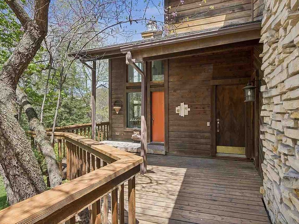 On 3/4 acre, this 3910 sq. ft. home has wooded views from upscale interior with white marble floors, Marvin windows, open staircase, 2 fireplaces, and solarium, among many attributes. The MAIN LEVEL's wraparound front porch opens to a 2-story foyer where the home’s generous natural light begins. The entertainment-friendly circulation space includes the LR, family room with fireplace, 1/2 bath, formal dining w/ wet-bar buffet, & eat-in kitchen open to outdoor dining deck. Atop the open staircase is a library/study with a wall of bookcases, huge window to the woods, and a railing overlooking spaces below. The UPPER LEVEL includes the home’s 2 spacious bedrooms. The primary suite has a mirrored wall visually expanding the room’s large dimensions and includes a huge walk-in closet. The en-suite bath includes a tiled walk-in shower and soaking tub and opens to an all-glass atrium also accessed from the BR. This curved-glass enclosure is ideal for plants and can serve as a reading/sitting room or exercise area. Adjacent to the primary BR is a nursery/flexible-use room with skylight. A generous guest/2nd BR has equally beautiful forest views and handy access to a full bath. The sizeable, flexible LOWER LEVEL can be accessed from a walkout patio and the inside staircase. The major portion is a family room with a massive stone fireplace and a wall-length wet bar.