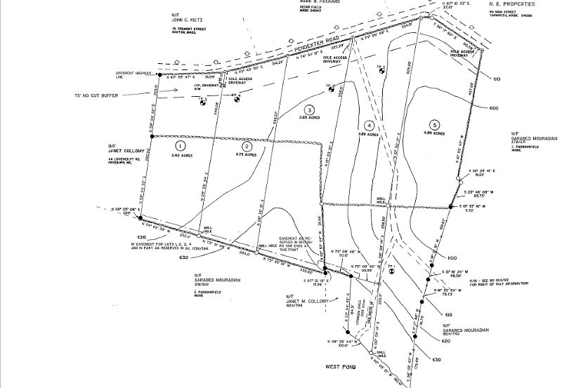 Lot 1 of a 5 lot older subdivision. Lots of beautiful stone walls and paved road frontage. Property is part of an old apple orchard and 50% is apple trees and meadow, the rest is mature white pine and hemlock. The five lots own the common lot shown with 100 feet of frontage on West Pond. Deeded ROW's from property to shorefront lot. Septic design done in 2018, some protective covenants. Agents welcome at 2% commission. Do not call with solicitations or offers to list on MLS.