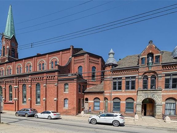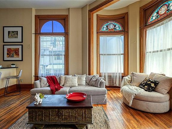 Charming home located in the FORMER ST. MICHAEL'S CHURCH & RECTORY*This historic condo includes stunning 13 ft ceilings, seven 10 ft windows (some w/ original STAINED GLASS), original doors/door hardware, original woodwork & wood floors & some red brick walls*Bright corner unit is easily accessible from the original doors of the church rectory*Unit has loft concept including open kitchen w/ dining island, cherry cabinets & Quartz Silestone counters*Master bedroom easily holds the current king sized bed & features a walk in closet w/ custom shelving as well as the utility closet w/ WASHER/DRYER*Upgrades include custom entry closet, new HVAC and H2O heater (2021) and wiring for alarm & sound system*Great common courtyard/GARDEN AREA w/ breathtaking CITY VIEWS*EASY ACCESS to hot spots, downtown, hospitals & colleges*LOW COST ON SITE PARKING:$25/month rear lot & $35/month attached garage*PETS & RENTALS permitted*Unit is fully handicap accessible.