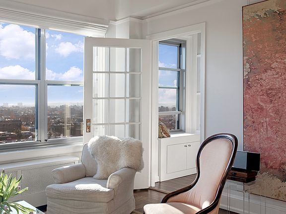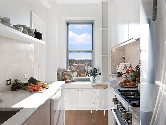 This huge 11th floor corner one bedroom at 1 Plaza Street West has spectacular sunrise to sunset views of Grand Army Plaza, Prospect Park, New York Harbor and Brownstone Brooklyn. Every room is filled with light and all the beautiful prewar detail of the Rosario Candela design. The owner, a celebrated food columnist, planned every aspect of the meticulous restoration, with subtle additions for storage, custom lighting and more. A graceful foyer opens to the expansive living and dining room and a fully renovated kitchen with Bertazzoni and Bosch appliances, honed Carrera marble counters, outstanding storage, a window seat with cabinet beneath and a coffee grotto. The windowed bath was beautifully updated. Each room affords water and park views that don't stop in a neighborhood filled with culinary and cultural destinations. Just outside the door are 500 acres of green space in Prospect Park, the year round Saturday Greenmarket, Brooklyn Museum, Brooklyn Botanic Garden, and the Brooklyn Central Library. BAM is minutes away and we will all be thrilled to return there. The B/Q & 2/3 express trains are on the corner. The co-op is beautifully maintained and pet-friendly. There is a live-in super, doorman, central laundry, air conditioner and bike storage.