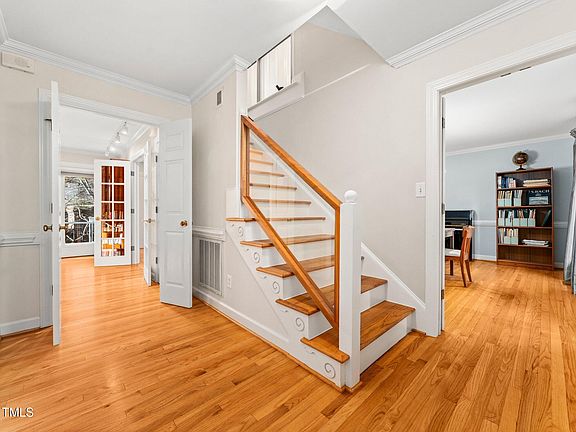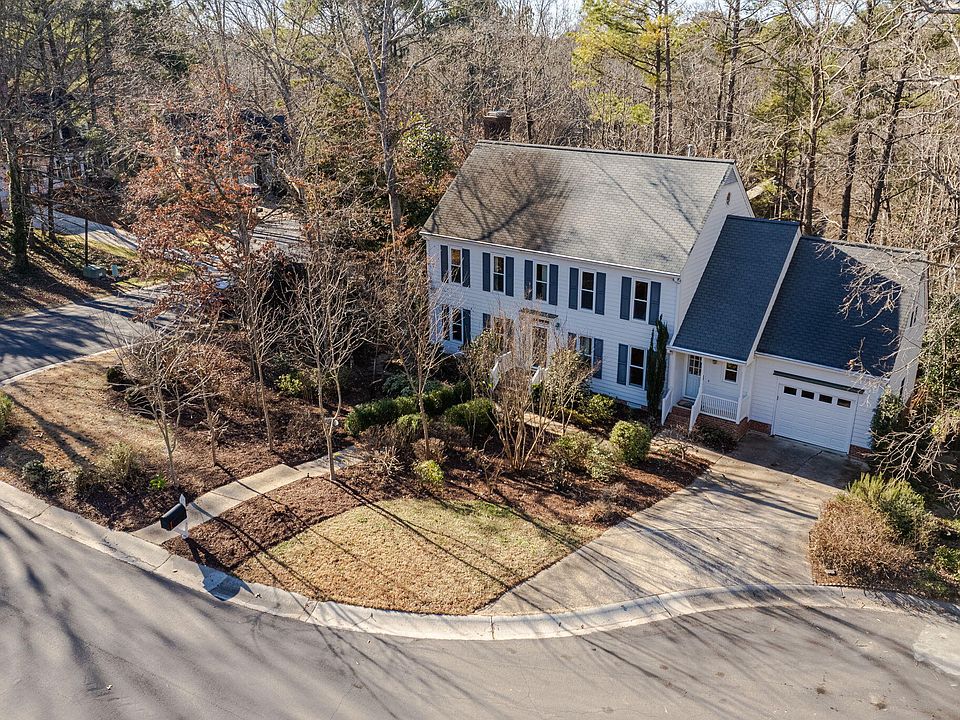 Welcome to 1 Pointe View Ct in the desirable Woodcroft neighborhood of Durham. This updated home is nestled in an inviting cul-de-sac, offering the perfect blend of modern design and natural beauty. With 4 bedrooms and a bonus room, the flexible floorplan provides countless configurations, making this home a haven for hide-and-seek games. the updated windows in almost every room flood the home with natural light, highlighting the sleek lines. The spacious downstairs area includes a small first-floor office with a view of the trees, perfect for finding inspiration. Step outside to enjoy your backyard, which offers both shade and privacy, creating a tranquil oasis. The new deck, built in 2024 with Trex low-maintenance decking, is perfect for outdoor gatherings. The walk-up attic provides ample storage space or the potential for a creative retreat. Additional features include an electric car charger, irrigation system, new garage door, and mostly replaced windows. This home is a true gem, combining contemporary flair with the charm of a well-established neighborhood.