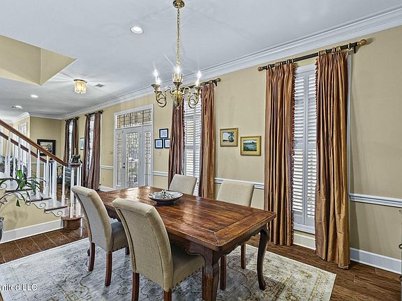 Nestled in the heart of northeast Jackson on a double cul-de-sac, this stunning raised Louisiana plantation-style home offers a serene retreat with breathtaking views of a neighboring pond. The curb appeal is undeniable, with a circular driveway lined by majestic oak trees and a charming wrap-around front porch. A beautiful leaded glass front door opens to a welcoming foyer with a grand staircase and sunlit front rooms adorned with rows of windows.