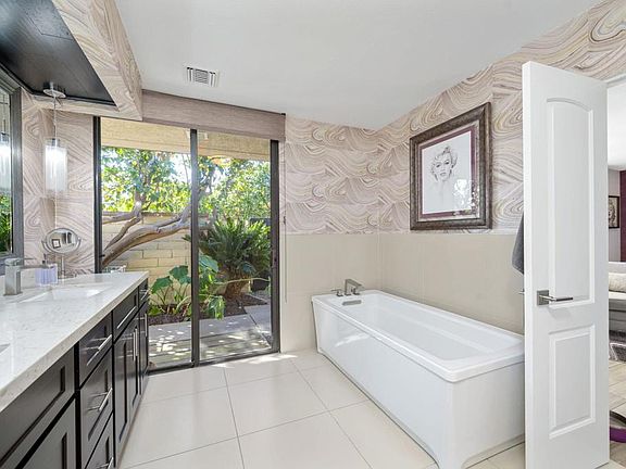 PRIVATE, LUSH and DONE!!!This home is absolutely move-in ready!The lush and newly designed wrap around patio, with new Alumawood patio cover, is the perfect place to entertain friends or relax in quiet solitude. It's also ideal for pet owners as it is off of the golf course and completely enclosed for your pets safety. You can drink in the western mountain views from the front courtyard and it would be a great space for a large, private spa.The kitchen features stainless appliances, quartz counters and custom cabinetry. Tile flooring throughout gives it a warm and sleek feel. The open concept living and dining room is very spacious and is framed by a beautiful stack stone fireplace. All bedrooms and bathrooms are remodeled and feature custom paint and wallpaper and the primary bath has a fabulous soaking tub. The third bedroom currently serves as a wonderful home office and media room. With all new ducting and 30 leased solar panels, (a nominal $207 monthly), this home is very energy efficient. New custom cabinetry in the garage affords you plenty of storage and will the envy of your neighbors! Located centrally within the gated community of The Springs, you have quick access to the newly remodeled clubhouse, golf course, pickle ball and tennis courts as well as bocce and fitness center. The Springs plays host to numerous clubs activities and events throughout the year providing a very active and fun lifestyle! Please call today to experience this home for yourself!