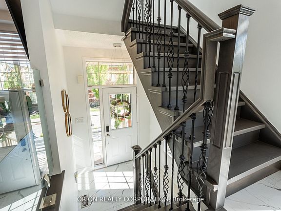 Executive End Unit Townhouse in the Heart of Georgetown! SMART HOME W/ PREMIUM UPGRADES! Experience over 2,040 sq. ft. of elegant, open-concept living in this beautifully upgraded executive end unit. This carpet-free home features rich hardwood and ceramic flooring throughout, combining style with elegance. The modern kitchen features quartz countertops & backsplash, stainless steel appliances, upgraded finishes, and a functional layout ideal for both everyday living and entertaining. The sun-filled dining area opens to a private balcony, creating the perfect indoor-outdoor flow. Spacious primary bedroom complete with a private Ensuite and a walk-in closet. Laundry room located on the upper floor for convenience! While the walk-out recreation room offers access to a serene, tree-lined a peaceful backdrop for gatherings or quiet evenings. Located in one of Georgetown's most desirable communities, you'll be steps from parks, downtown shops, the farmers' market, the library, GO Transit, and schools. POTL Fee: $132.66/month