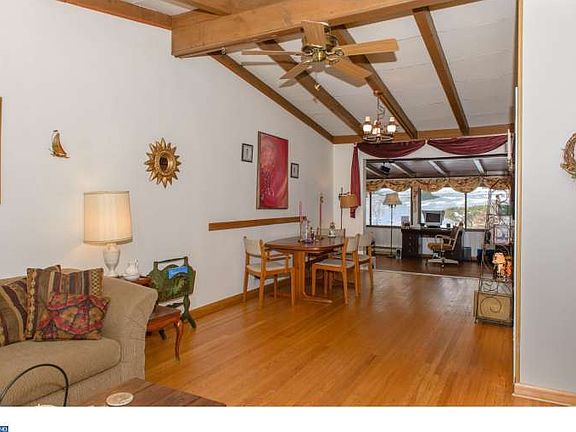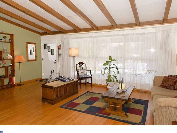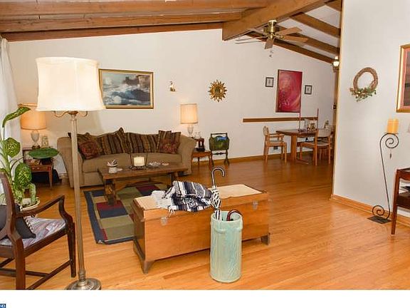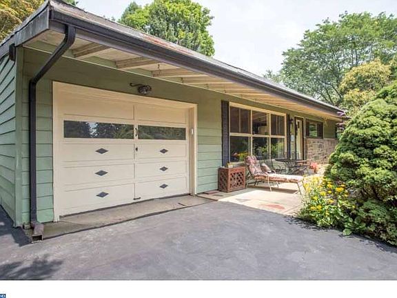 NEW PRICE! Don't just drive by...1 Queen Anne Lane is a surprisingly large private home with a spacious feel and expansive views to the park like private backyard! The walls in the dining room and eat-in kitchen have been opened up. This California rancher has vaulted beamed ceilings and hardwood floors throughout. The living room flows into the dining room, and the kitchen is open to the eat-in kitchen with skylight. The all season sunroom/home office addition has wall to wall custom windows affording beautiful backyard views and includes baseboard heat, track lighting and access to the oversized one car garage. A full bathroom with new light fixtures, polished original tile, and cast iron tub is across from two spare bedrooms with custom windows, and deep closets as are the coat and linen closets along the hallway. The larger master bedroom has great views of the backyard, good closet space, and an attached en suite bathroom featuring a walk-in shower and the original tile work. The finished basement has convenient access from the living/dining room area. The laundry hook ups are on your left as well as two cedar closets; one is a large walk-in. There is also storage underneath the stairs. A work area featuring built-in shelves and work bench provides the perfect area for home DIY projects. The other half of the basement is functioning as a TV area with an exposed brick wall and large woodstove. From here you can access the 'rec' area which currently houses a pool and ping pong table and a dry bar at the end of the room. This charming, unique property will appeal to nature lovers and creative minds who may wish to do more updates, and a further plus is its close proximity to Malvern shops, dining and train station.