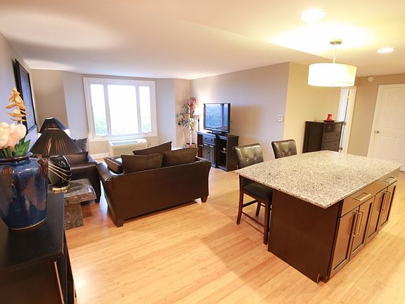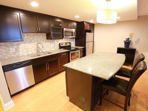 Beautifully renovated one bedroom one bath condo in Palatine. Upgraded unit with custom kitchen and large island. Dividing wall was removed creating awesome open floor plan. Kitchen features dark espresso cabinets, stainless steel appliances and granite coutertops. Renovated bathroom with modern vanity and shower stall with glass doors. Great unit with bamboo flooring and newer dual pane energy efficient vinyl windows. Replaced heating/cooling wall units with wall mounted thermostats. Eleven floor unit with great views. Two exterior parking spots. Elevator building with doorman, gym, party room and swimming pool. Close to public transportation, Metra, Library, Mariano's and local shopping. Check it out today