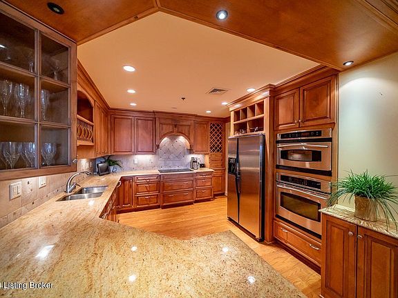 PENTHOUSE! Love views from almost every room this condo is for you! Lovely finishes throughout. Walk into the foyer w/ hardwood floors & inlaid marble. The open living area features hardwood floors in the living, dining, kitchen & hallway. Vaulted ceilings in the living room have additional windows only available in a penthouse. The living room opens up to an enclosed balcony w/ sliding window allowing use through all seasons. The kitchen has abundant cabinets w/ custom wine & plate racks, separate cooktop, range & Stainless Appliances. The kitchen granite has a curved glass breakfast bar. The master bedroom is set up to focus on the skyline view & has access to the covered patio. The master bath features a walk-in shower w/ multiple shower heads, soaker tub, double vanities, water closet & walk-in closet. The master has a den with custom built-ins & can also serve as a 3rd guest room. The 2nd bedroom shares a Jack-n-Jill bath w/ the den/3rd bedroom. Each bedroom has its own vanity & share a tub/shower. Bonus half-bath! Deeded parking spaces 361 &362. Premier location for Thunder Over Louisville w/ the everyday convenience of walking to multiple restaurants & entertainment options. Harbours is a premier property with gated entries, fitness center, indoor & outdoor pools, grills on-site, patio/gazebo areas. Lease includes HOA amenities of cable, high speed internet, HBO, Showtime, water, sewer, trash & master insurance. Turnkey rental includes electric.